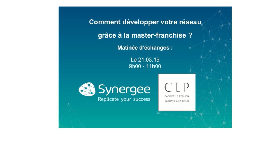 Synergee et le cabinet d’avocats CLP Avocats organisent une matinée d’échanges consacrée à la master-franchise : Comment développer votre réseau grâce à la master-franchise ? Jeudi ...